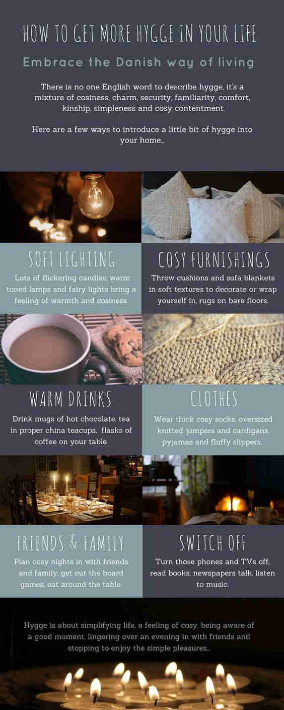 התחממות מול האח תוך שתיית משקה חםארוחה ביתית עם חברים לאור נרותלבוש נוח וחמים כמו סוודר רך, גרבי צמר או נעלי בית, כשבחוץ סופת גשמיםצפייה במקום בבית או מקום סגור אחר אשר נראה שהוא משרה את אוירת הנעימות (למשל "הסלון שלכם נראה מאוד הוגה" או בהטייה דנית הוגליט Hyggeligt)